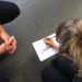 Put a finger in a cup filled with golden liquid colour, and draw a shape on your skin and on another skin.