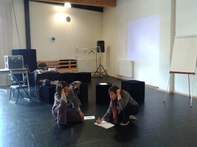 Exercice proposé par Emelyne : à partir d’un mouvement simple – assis à genoux, inclinaison latérale du buste à droite et gauche alternativement - explorer sa répétition, rythmes, puis différentes qualités, puis varier les chemins de mouvement. De la forme à la créativité.